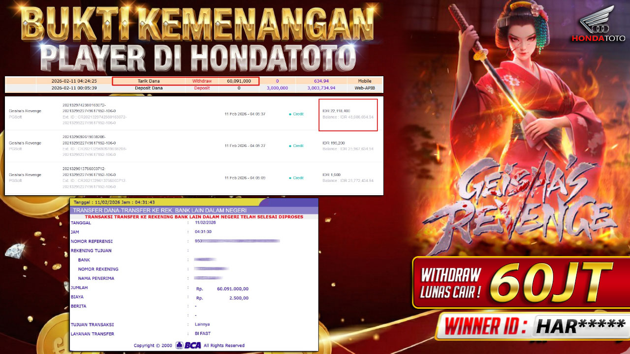 Bandar togel HONDATOTO merupakan bandar togel dan slot online yang membayar semua kemenangan member hingga lunas. Setiap pembayaran pada situs kami dilakukan dengan cara transfer ke rekening tujuan yang sudah di daftarkan pada situs togel online kami, Pembayaran hanya dapat di proses jika rekening yang di daftarkan telah valid dan dapat di transfer. Semua kemenangan member yang mendapatkan hadiah jackpot terbesar akan kami posting agar semua pemain dapat melihat bandar situs terpercaya HONDATOTO ini membayar semua kemenangan member hingga lunas. Setiap postingan yang kami posting akan kami lakukan sensor pada nomor rekening 4 digit dan nama rekening untuk menjaga privasi dan kerahasiaan member. Postingan Jackpot yang kami posting agar member atau pemain yang belum pernah bermain bisa melihat bandar togel Bukan Kaleng Kaleng Seperti HONDATOTO ini, Semua postingan jackpot yang kami posting dapat di lihat data keasliannya melalui nomor reff yang di tunjukan pada bank atau mbanking saat kita melakukan transfer.
